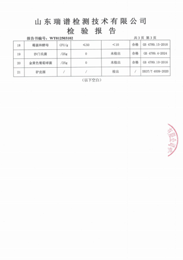 檢測結(jié)果顯示,美宸天膠的鉛、砷、汞等有害物質(zhì)均未檢出或遠(yuǎn)低于安全限值,微生物指標(biāo)(如菌落總數(shù)、霉菌等)更是優(yōu)于國家標(biāo)準(zhǔn)數(shù)倍,確保每一片阿膠都純凈安全。