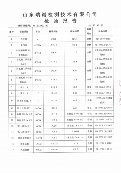 根據(jù)最新檢測報告(編號:WT012503102),美宸天膠的蛋白質(zhì)含量高達(dá)84.4g/100g,遠(yuǎn)超國家標(biāo)準(zhǔn)(≥75.0g/100g),為人體提供優(yōu)質(zhì)蛋白來源。此外,核心氨基酸如L-羥脯氨酸、甘氨酸等含量均顯著高于行業(yè)要求,充分體現(xiàn)其原料純正與工藝精湛。