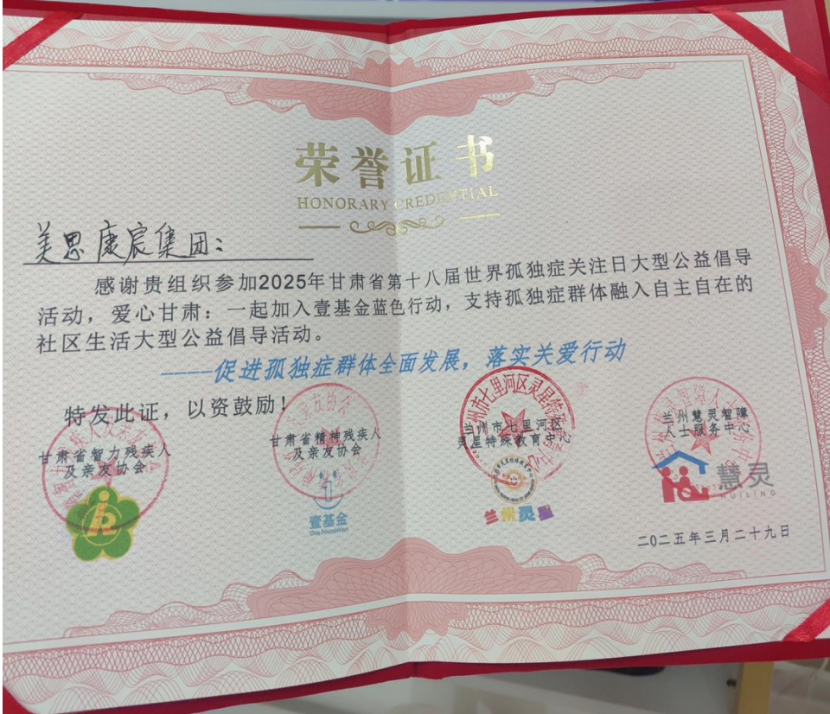 2025年4月2日是第18個世界孤獨癥關(guān)注日。為傳遞社會關(guān)愛,3月29日,由蘭州市殘聯(lián)指導(dǎo)、多家公益機構(gòu)聯(lián)合主辦的“藍色倡導(dǎo)活動月”啟動儀式在蘭州萬達茂圓滿舉行。美思康宸集團作為愛心企業(yè)代表受邀參與,以實際行動踐行社會責(zé)任,助力孤獨癥群體融入社會。