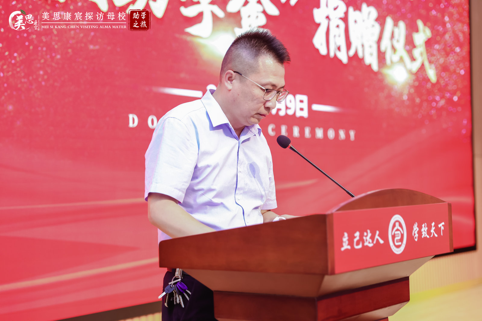 捐贈儀式上,雷華校長代表全校四千余名師生,向遠道而來的所有美思康宸的朋友們表示熱烈的歡迎,向公司及員工捐資助學的義舉致以最崇高的敬意,同時向大力支持我校教育事業(yè)發(fā)展,關心我們下一代成長的各級領導表示最誠摯的感謝。