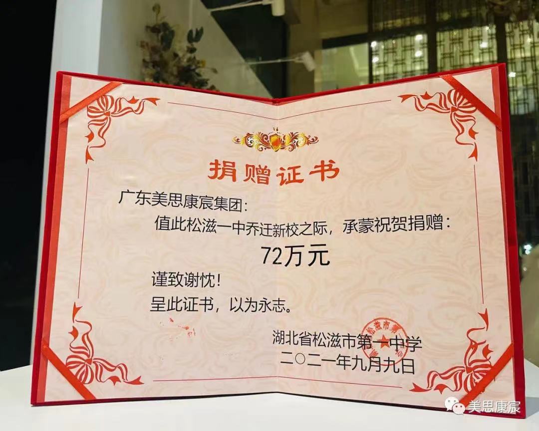 2021年9月9日,在教師節(jié)即將來臨之際,美思康宸來到松滋一中,舉行捐贈助學金儀式。正值第37個教師節(jié)之際,美思康宸在捐贈50萬元后,現(xiàn)場又籌集了22余萬元教育專項善款。前后美思康宸共為松滋一中捐贈獎學教助金72萬元整,少年強則國強,美思康宸,希望更多的優(yōu)秀學子能夠奮發(fā)圖強,學好本領,增長才干,將來以自身之力報效祖國,回饋社會,反哺家鄉(xiāng)。重視教育就是保護未來,發(fā)展教學工作功在當代利在千秋。
