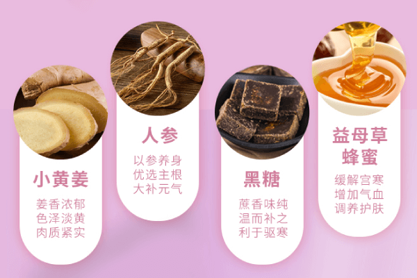 根據(jù)東方女性身體寒涼狀況,特別研發(fā)這款溫補姜茶。除日常配方中的黑糖和小黃姜外,添加了人參、枸杞、橘皮、益母草蜂蜜等各類溫補食材,熬制成人參姜母暖暖茶,暖身同時更注重日常溫補。